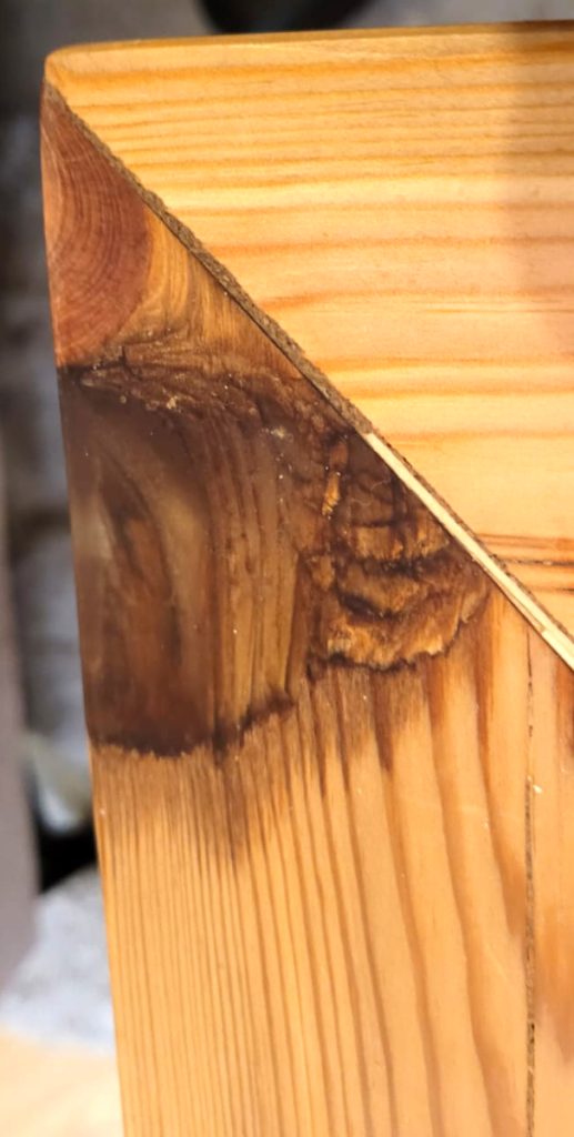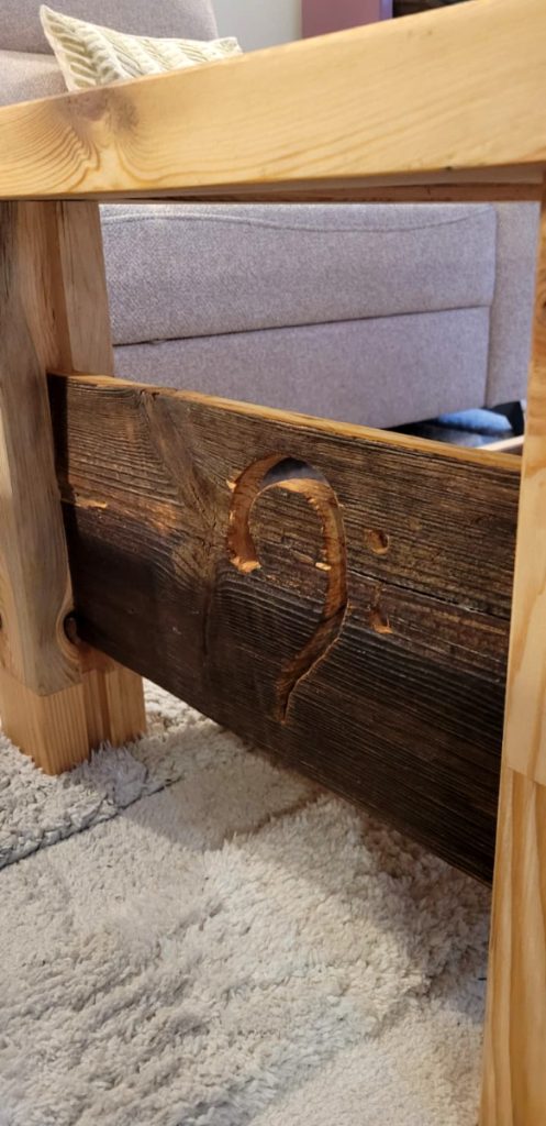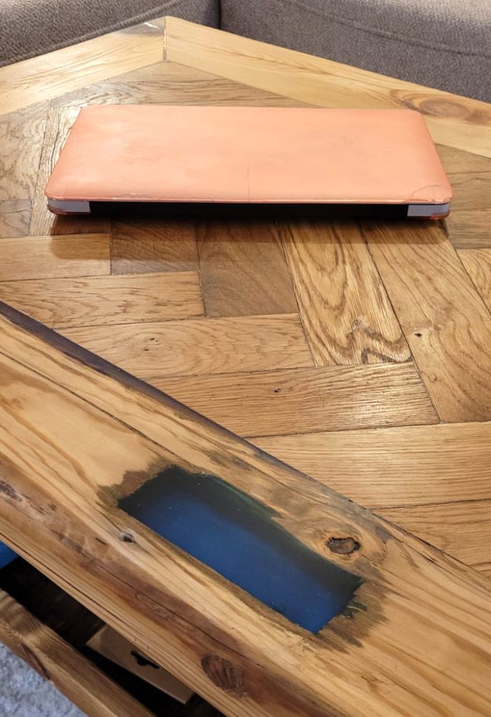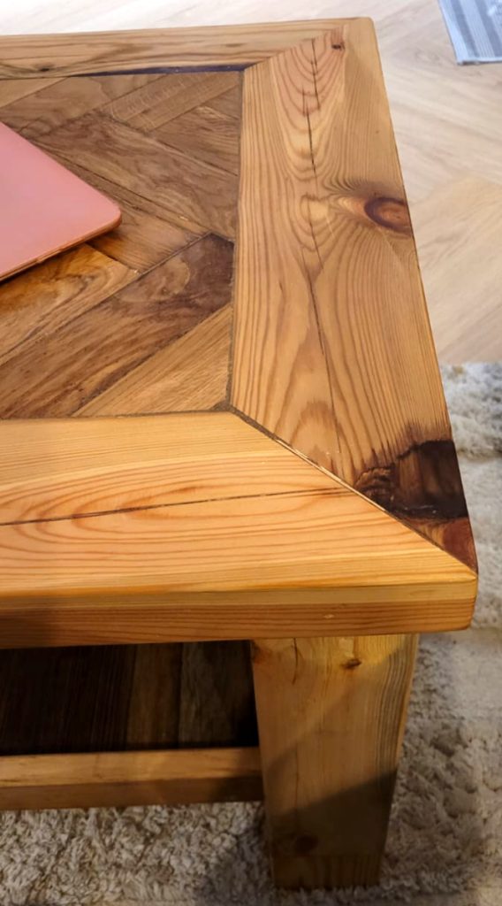 Stolik kawowy, rama z desek odzyskanych z wymienianej więźby dachowej szkoły muzycznej na Krasińskiego w Warszawie. Blat, klepki z podłogi przedwojennej kamienicy w Al. Ujazdowskich tegoż miasta. Żywica współczesna.